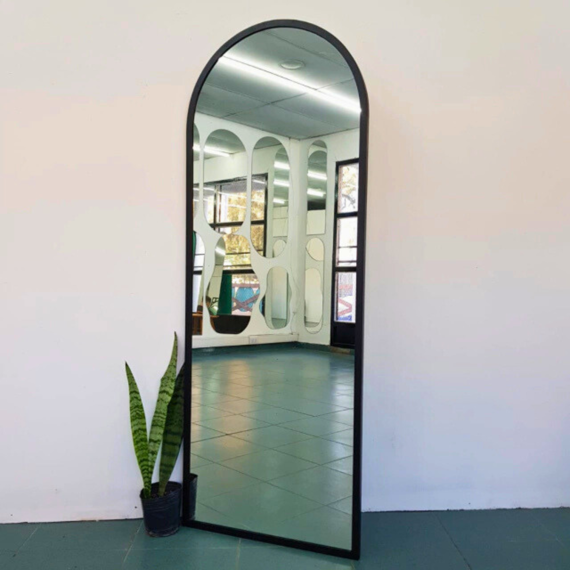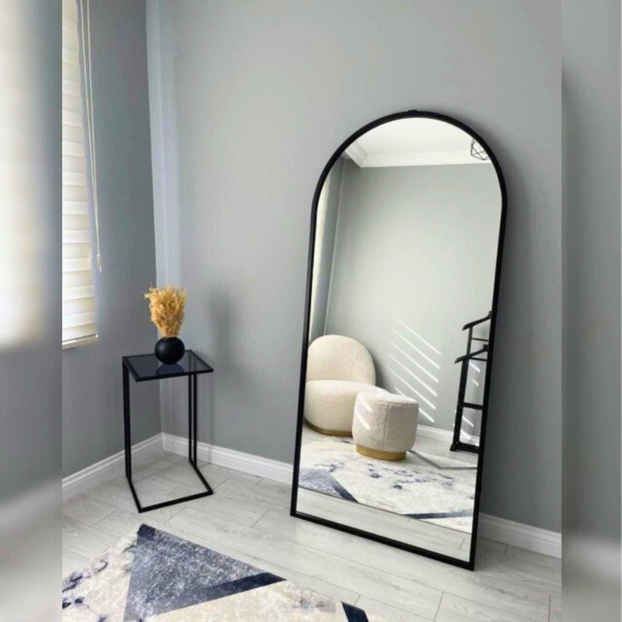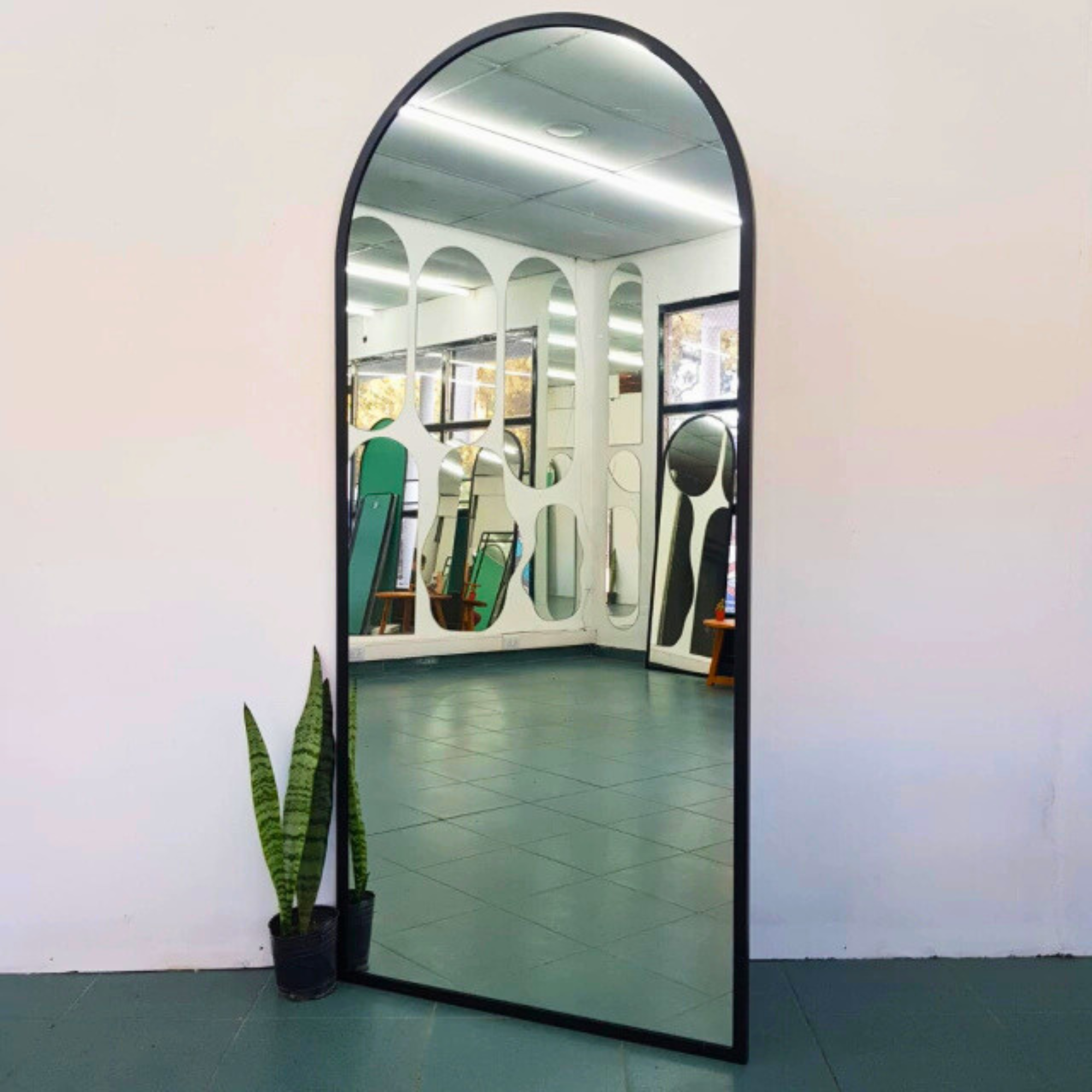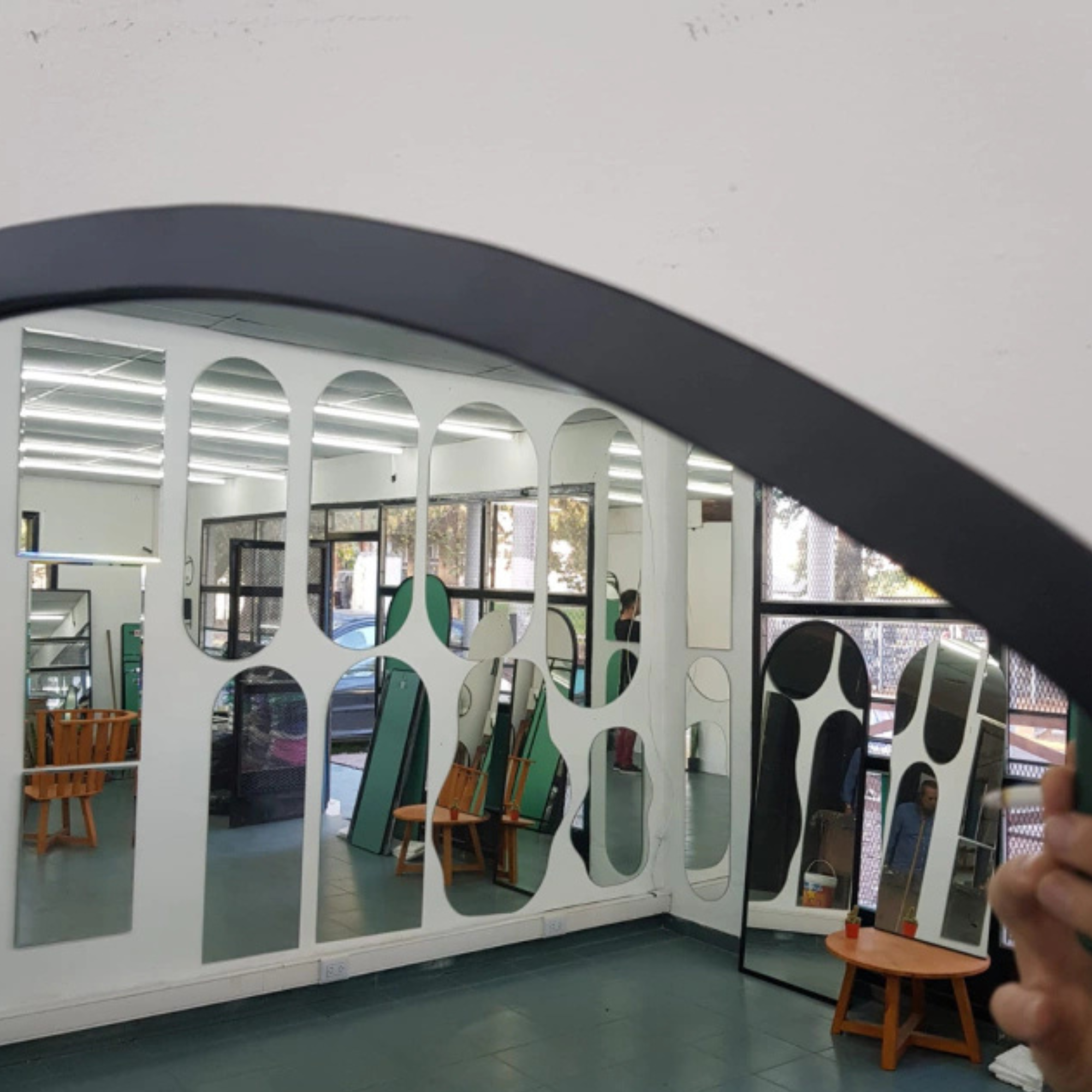 El perfil del marco acompaña la forma curva del espejo, aportando presencia visual sin perder armonía. Fabricado con materiales de calidad y excelente terminación, está orientado a comercios, estudios y proyectos que buscan un producto diferenciado en volumen.