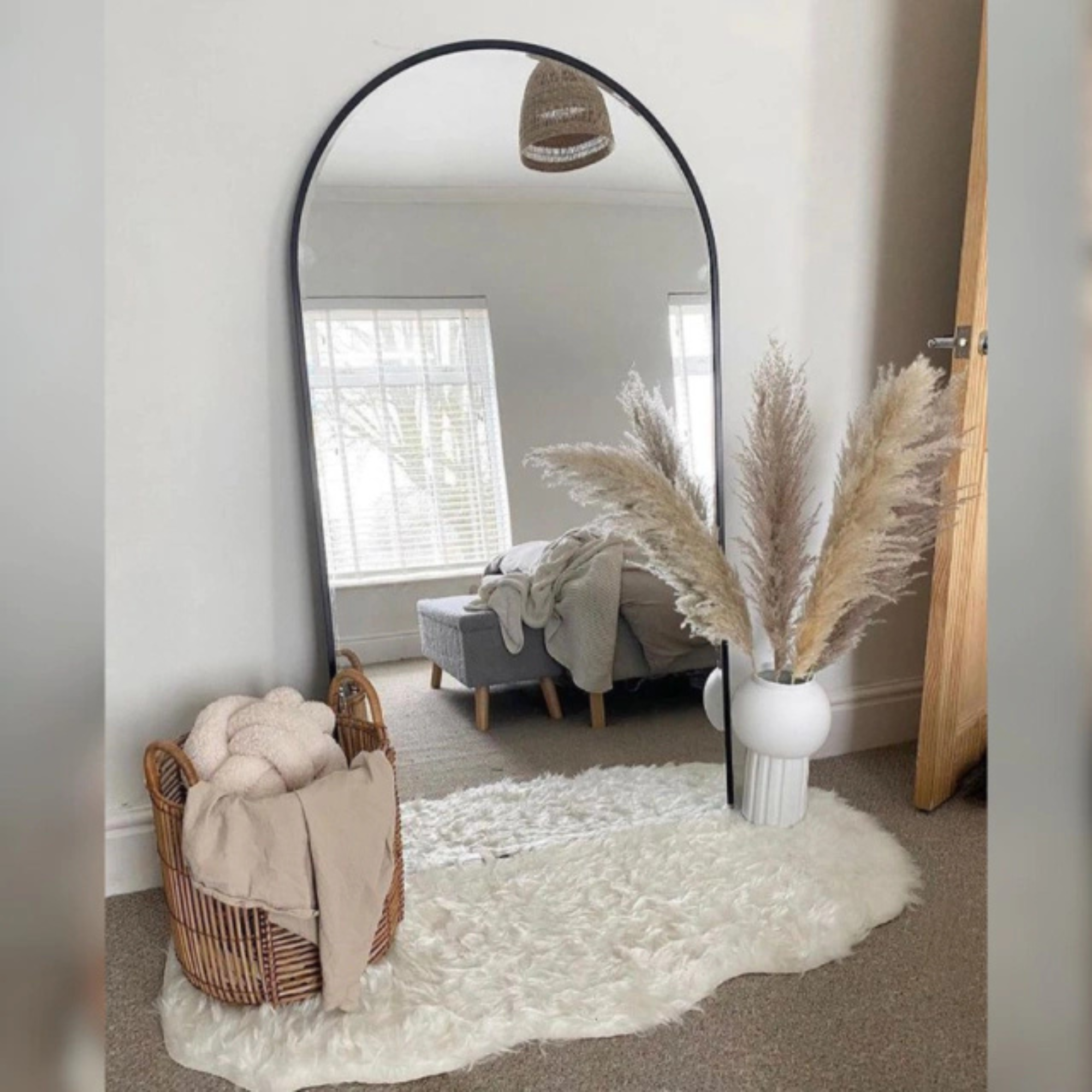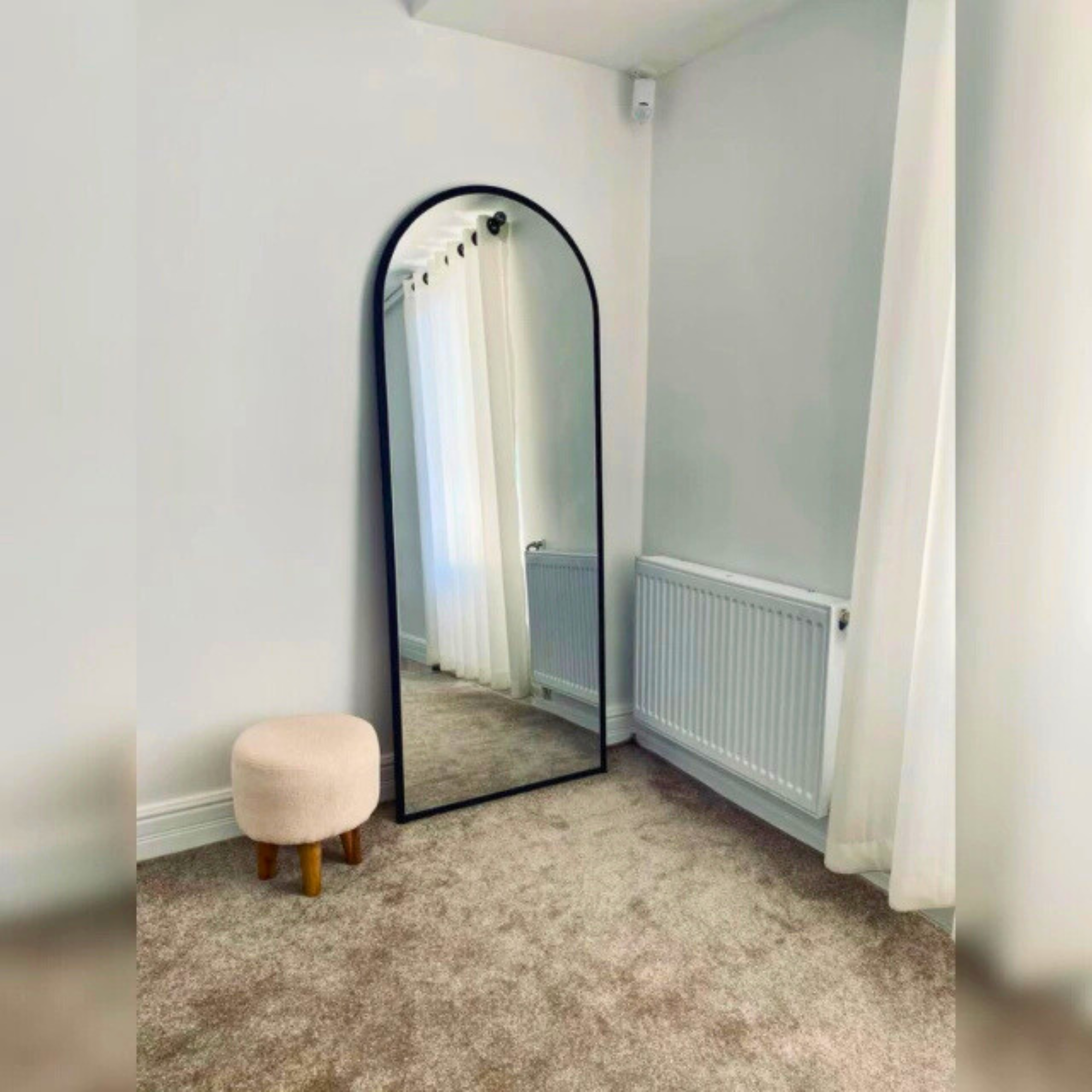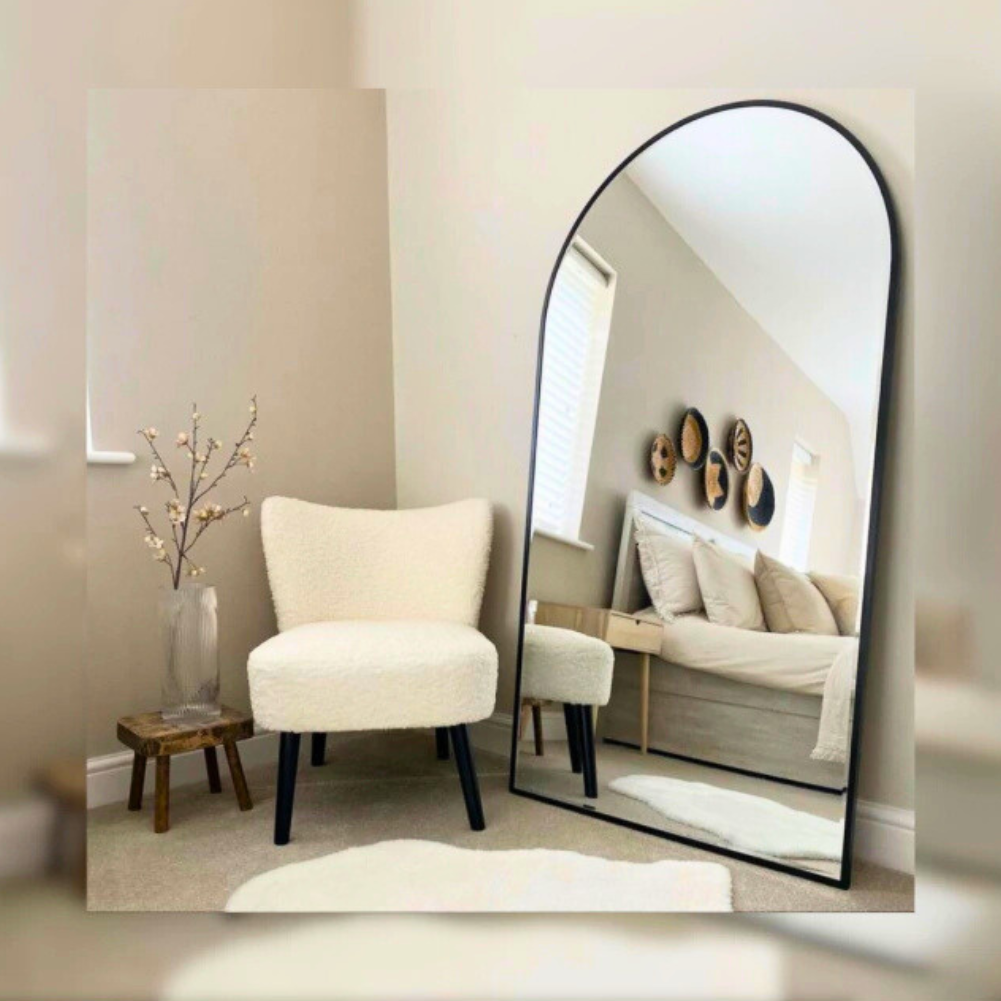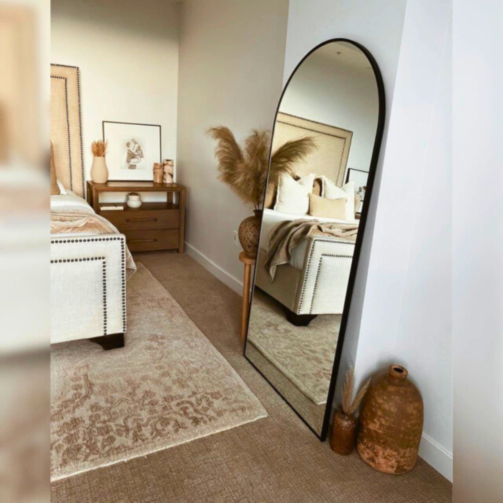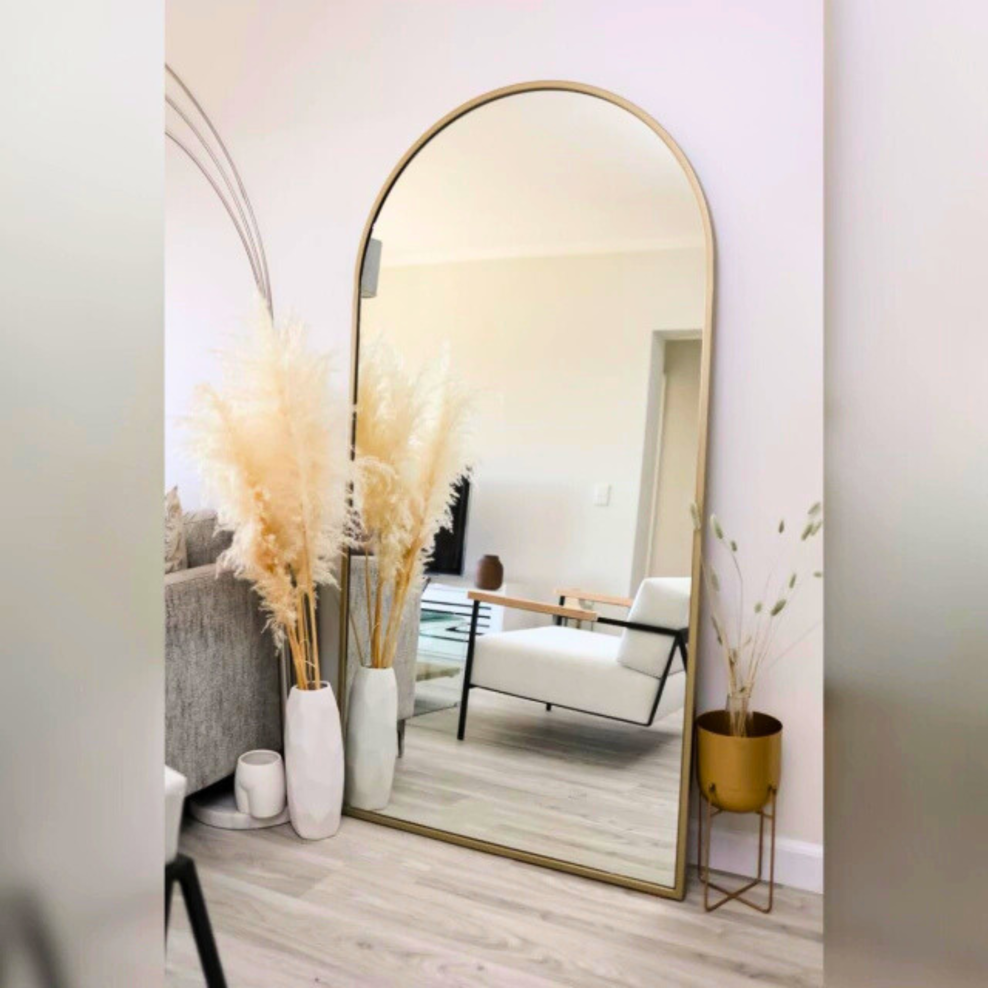 El perfil del marco acompaña la forma curva del espejo, aportando presencia visual sin perder armonía. Fabricado con materiales de calidad y excelente terminación, está orientado a comercios, estudios y proyectos que buscan un producto diferenciado en volumen.